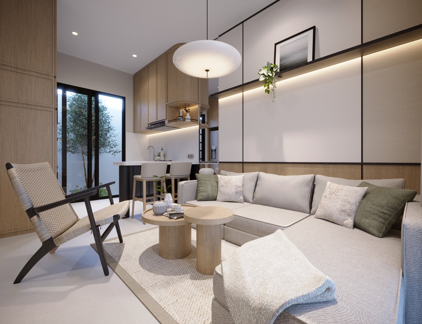 A space with a fully furnished living room, a cozy bedroom, a well-appointed kitchenette and built-in bathroom.